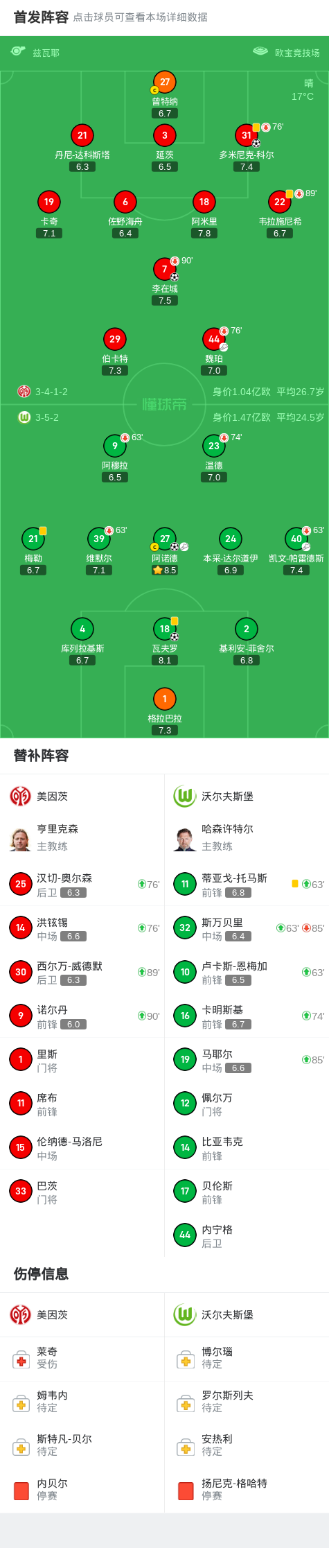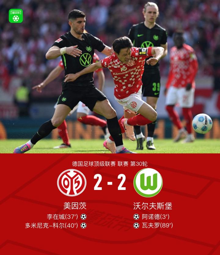 本场比赛最大的亮点是沃尔夫斯堡的阿诺德,他在比赛中两次助攻,成为球队的关键人物。其精准的传球和冷静的处理能力为球队带来了关键进球,也展现了他在场上的绝对统治力。而李在城和多米尼克-科尔也展现出了自己的得分能力,为美因茨在比赛中保持竞争力。